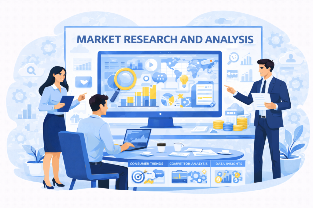 Involves gathering and analyzing data about market trends, customer preferences, and competitive landscape to inform strategic decisions and identify growth opportunities.